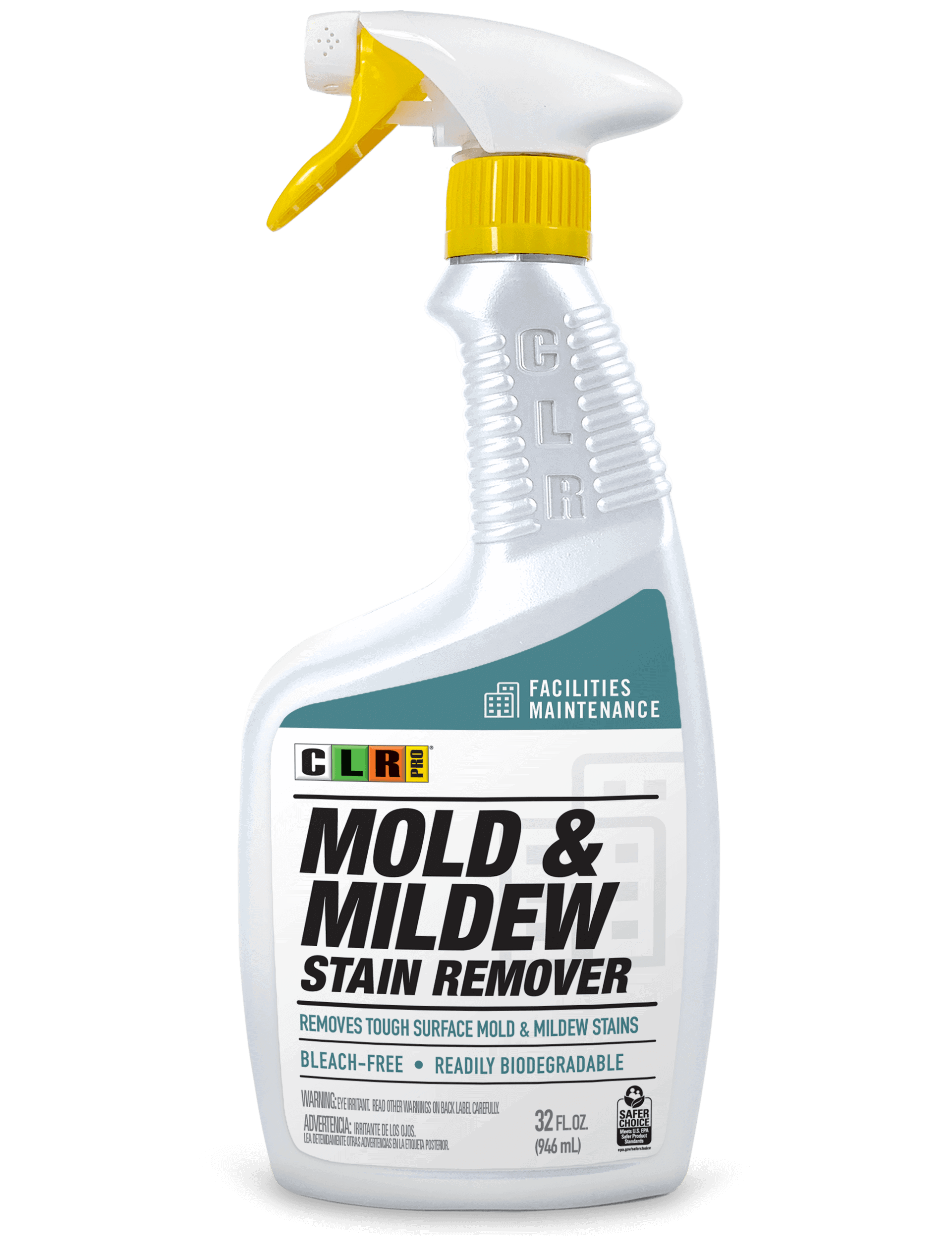 CLR PRO® Mold & Mildew Stain Remover Quickly removes tough surface mold and mildew stains on a wide variety of surfaces. Bleach-free formula quickly removes tough surface mold and mildew stains. Powerful foam spray removes tough mold and mildew stains from tile, showers, bathroom surfaces, hard plastics, wood, grout and fiberglass. Effective on a wide variety of surfaces including painted walls, ceramic tile, hardwood floors, baseboards, fabrics, glass, metal, marble & laminated countertops. It should not be used on metals or finishes, especially chrome or stainless steel. The foaming solution helps prevent splash-back & helps maximize contact time on cleaning surface. Part of the EPA’s Safer Choice Program recognizing the product as a safer alternative to harsh chemicals without sacrificing the quality or product performance. Manufactured in the USA.